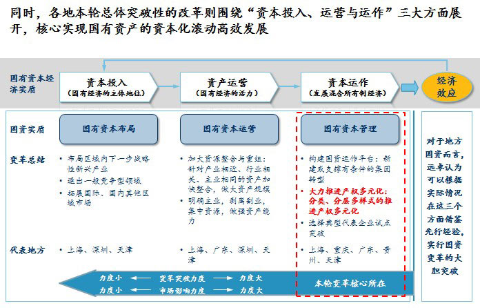 基于以上的判斷,遠(yuǎn)卓并非簡單的從四大方面對地方國資國企改革進(jìn)行剖析,而從參與市場的核心——國資資本化的角度來提煉總結(jié)各地已推進(jìn)的改革,并對有效的突破性改革進(jìn)行總結(jié)分析,去除表面的“應(yīng)付性”改革舉措;我們認(rèn)為打通資本化的核心三要素——資本投入、資產(chǎn)運營和資本運作,是地方國資國企改革的重點路徑。