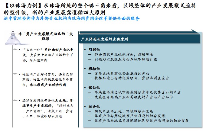 案例注釋:以珠海為例(遠(yuǎn)卓管理咨詢作為外部專業(yè)機(jī)構(gòu)為珠海國資國企改革提供全面的服務(wù)),遠(yuǎn)卓總結(jié)了珠海所處的珠三角區(qū)域產(chǎn)業(yè)發(fā)展模式的問題,并建立未來區(qū)域產(chǎn)業(yè)發(fā)展的核心原則——根植性、錯位性、融合性。