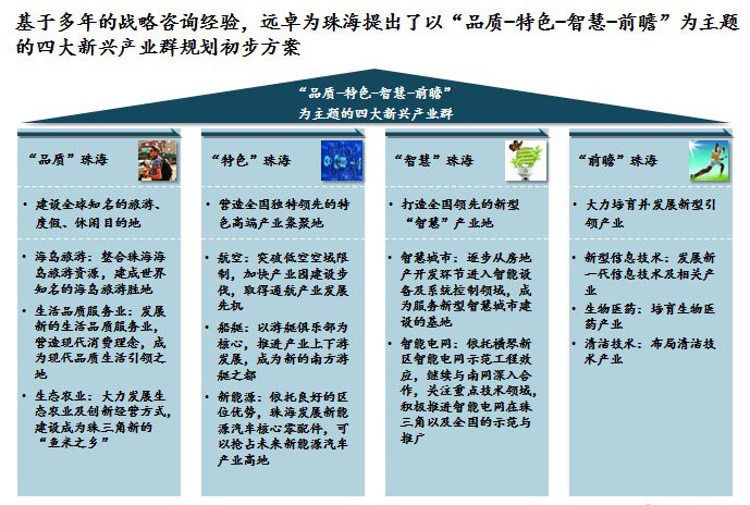 基于以上四大原則,遠(yuǎn)卓為珠海提出了適合珠海本地及珠三角西岸經(jīng)濟(jì)發(fā)展的四大產(chǎn)業(yè)主題群規(guī)劃初步方案——“品質(zhì)、特色、智慧、前瞻”,并指出珠海國資國企在四大產(chǎn)業(yè)集群中的布局現(xiàn)狀與未來布局要點,同時提出了促進(jìn)產(chǎn)業(yè)發(fā)展的國資國企的核心舉措。