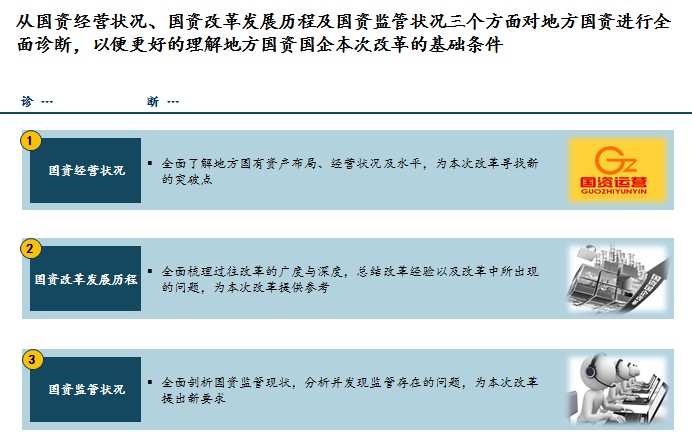 解析完三大背景的述求,回到地方國資國企本身,尋找地方國資自身的發(fā)展述求則是更好的進(jìn)行改革的基礎(chǔ)條件,遠(yuǎn)卓會從國資經(jīng)營狀況、國資改革發(fā)展歷程和國資監(jiān)管狀況三大方面進(jìn)行全面的診斷:全面了解地方國有資產(chǎn)布局、經(jīng)營狀況及水平,為本輪改革尋找基礎(chǔ)突破點;同時全面梳理國王改革的廣度與深度,總結(jié)改革經(jīng)驗以及改革中所出現(xiàn)的問題,為本次改革提供參考;全面剖析國資監(jiān)管現(xiàn)狀,分析并發(fā)現(xiàn)監(jiān)管存在的問題,為本次改革提出新的方向要求。