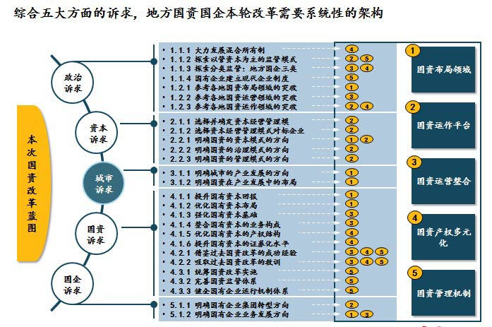 1、政治及政策述求:以資本的視角看待本輪政策導(dǎo)向,圍繞“資本投入、運營與運作”三大方面展開,實現(xiàn)國有資產(chǎn)的資本化滾動高效發(fā)展