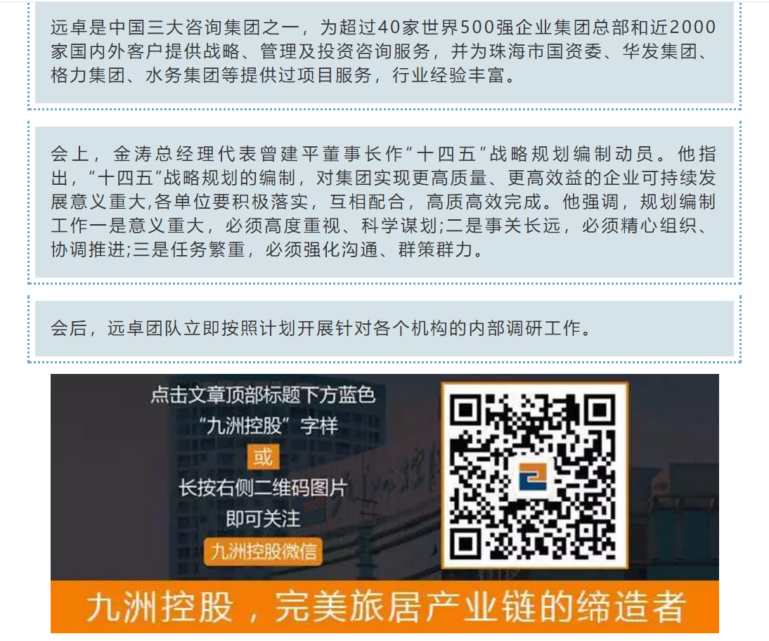 遠卓成功簽約珠海九洲控股集團“十四五”戰(zhàn)略規(guī)劃咨詢項目,并召開“十四五”戰(zhàn)略規(guī)劃咨詢項目啟動大會。以下內容截屏自珠海九洲控股集團官方微信公眾號。