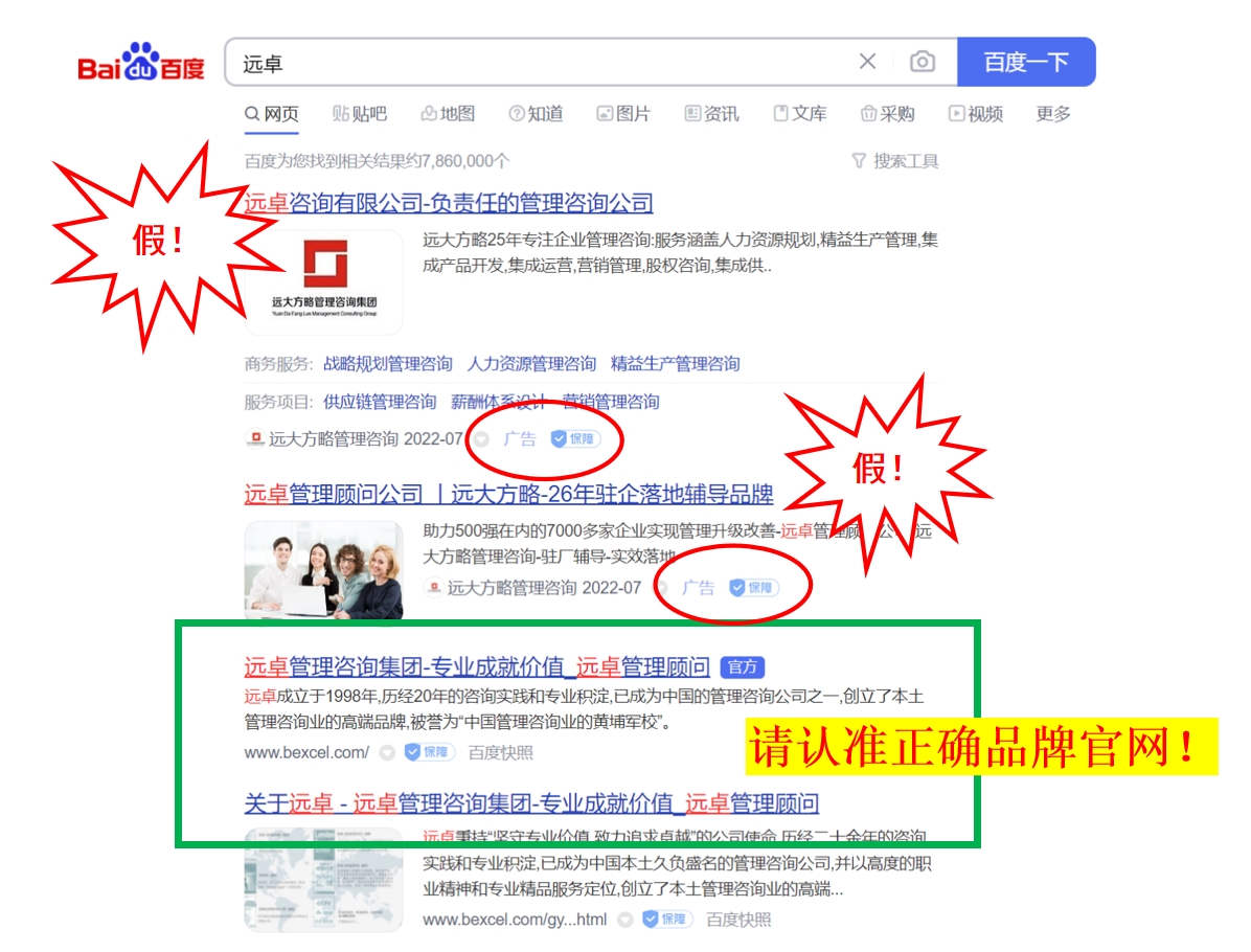 近日我司發(fā)現(xiàn):在百度搜索“遠卓”時,出現(xiàn)“遠卓管理咨詢集團-遠大方略-26年駐企落地鋪導(dǎo)品牌”、“遠卓咨詢有限公司-負責(zé)任的管理咨詢公司-遠大方略管理咨詢集團”等標(biāo)題詞條進行推廣宣傳,并清晰為百度“廣告”推廣。